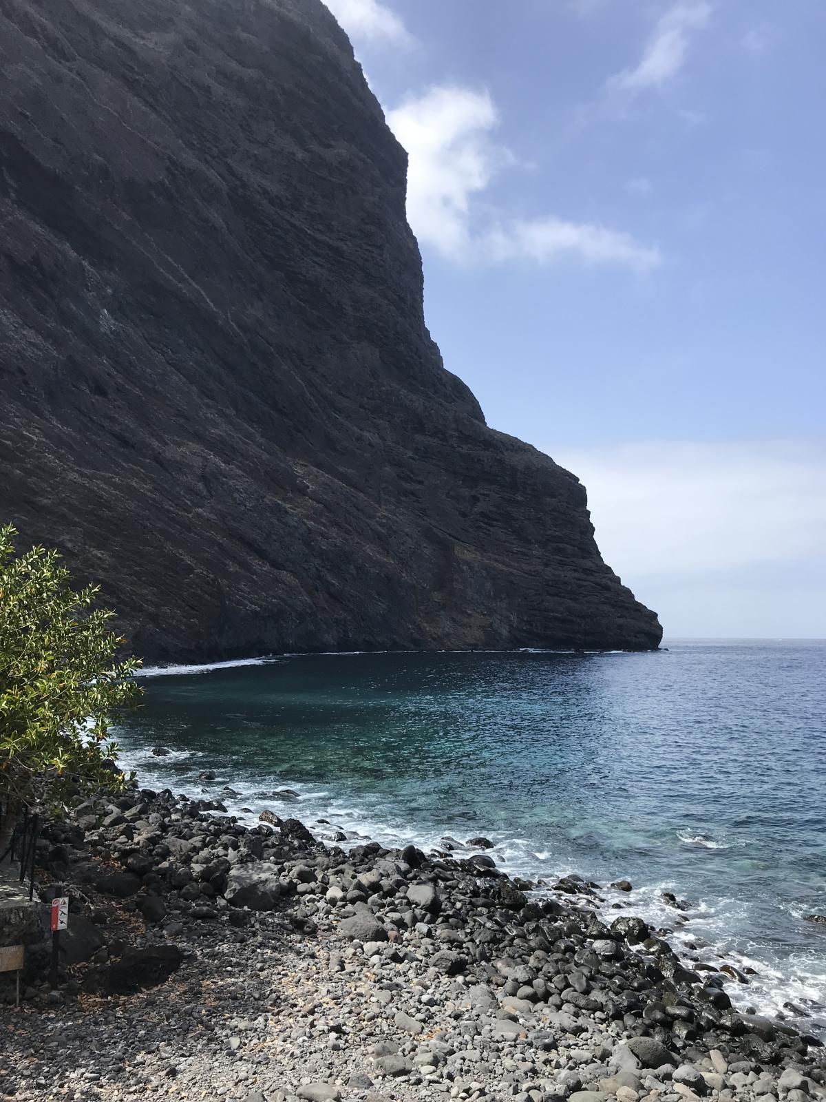 V polovině výletu, čili na úplném konci rokle, na vás čeká krásná pláž. Je sice divoká a kamenitá, ale nikdy jsem nikde jinde na ostrově neviděla čistší vodu než v Masce! Pokud máte chuť se vykoupat (a musím vás znovu varovat: ujistěte se, že je oceán dostatečně klidný, abyste to mohli udělat bezpečně, protože nezapomeňte, že pojištění se nevztahuje na koupání v oceánu), doporučuji dojít ke kulatému molu, ze kterého do vody vede žebřík, který vám koupání usnadní. Ale moc se nevyčerpejte, protože to nejhorší je ještě před vámi 😉