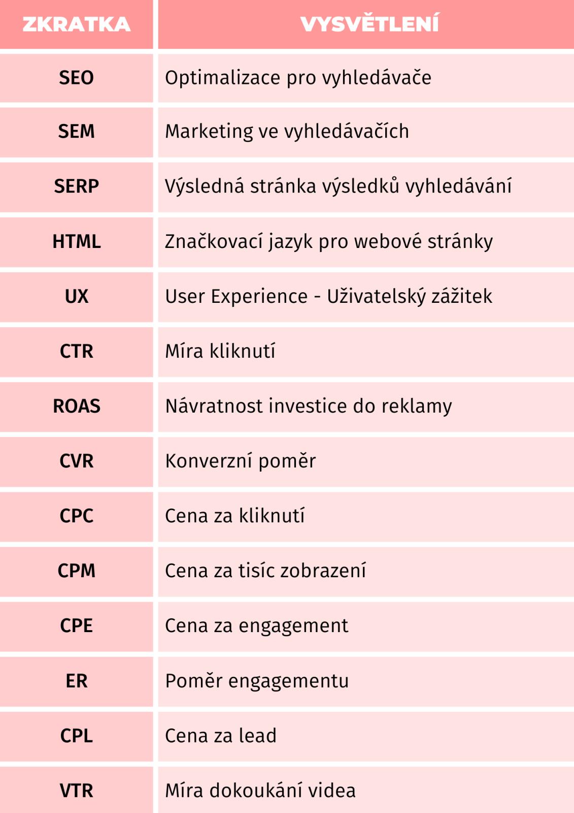 Marketing je plný zkratek a termínů, které mohou být pro začátečníky matoucí. Abyste se však mohli sebevědomě pohybovat v oblasti marketingu, zejména pak v digitálním prostředí, bez znalosti těchto zkratek se neobejdete.
