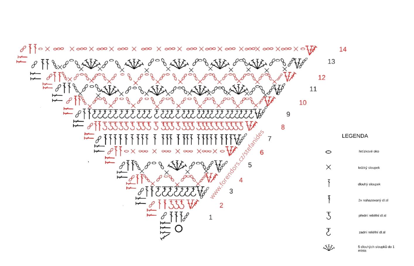 Začátek, 1RO, 1 sloupek minulé řady vynecháme a do dalšího uháčkujeme 1KS. 3RO, 1KS pod oblouček, 3RO, 1KS do prostředního z 5DS, 3RO, 1KS pod oblouček, 3RO, 1KS do předposledního DS před středem, střed, opakujeme druhou polovinu řady, konec