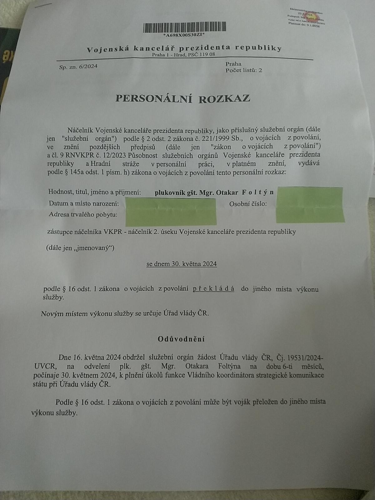„Pan Otakar Foltýn bude na Úřadu vlády působit jako vládní koordinátor pro strategickou komunikaci, pro tuto funkci bude (z Vojenské kanceláře prezidenta republiky pozn.red.) odvelen na šest měsíců od 30. 5. 2024,” uvedla mluvčí vlády Lucie Ješátková 21.května 2024.