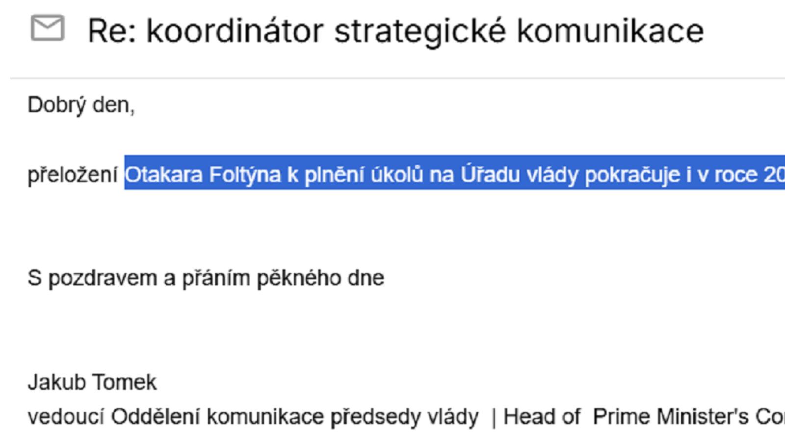 Mise Otakara Foltýna v pozici vládního zmocněnce pro strategickou komunikace měla být původně půlroční. Začala 30. května a měla skončit k 30. listopadu. Na můj dotaz, zda k tomuto datu Otakar Foltýn skutečně skončil, mi vedoucí oddělení komunikace předsedy vlády Jakub Tomek odpověděl, že bude pokračovat i v roce 2025.