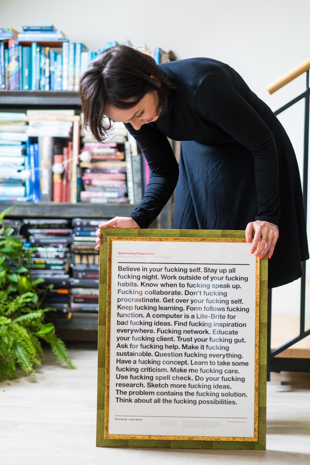 Konkrétně tenhle z Good fucking design advice. Mám ho naproti pracovnímu stolu a kdykoliv se mi nechce, chvíli si ho čtu. Většinou mi oči ulpí na tom správném řádku, na větě, co zrovna dneska potřebuju slyšet. Věř si kurva. Ozvi se kurva. Udělej si přípravu. Kurva!