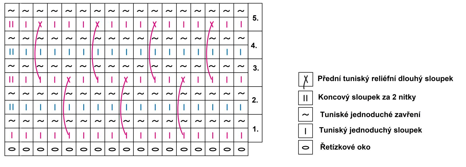 Uháčkujeme 3 TJS, pak nahodíme na háček a pichneme háček obřadu pod 2 nitky sloupku z řady ve stejné barvě (podebereme obě nitky sloupku, jak přední tak i zadní), vytáhneme očko a protázhneme přízi tímto vytaženým okem a nahozeným okem - uháčkovali jsme Přední tuniský reliefní dlouhý sloupek (PTRDS). Pokračujeme stejně, uháčkujeme 3 TJS a 1 PTRDS a střídáme až do konce půlřady. Zakončujeme TJZ, kde na konci vyměníme barvu