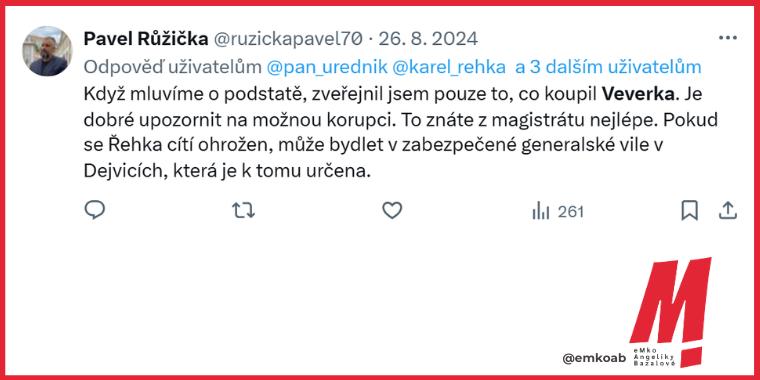 Veverka navíc zjevně dům za 18 milionů koupil přímo pro Řehku a jeho novou partnerku. Nákup proběhl v květnu 2024 a dům se nachází přímo v obci, kde Michaela Opltová bydlí a působí ve funkci starostky. Obavy, zda se mu Řehka za tuto službu nebude cítit zavázán, jsou logické a musely zákonitě přijít. Ostatně, nemyslí si to jen poslanec Růžička. Že si Řehka zbytečně nabíhá a že celá situace “zavání průšvihem” napsal už v červnu ve svém komentáři například i Radek Kedroň, komentátor Seznam Zprávy: “Nájemní smlouva Řehky s Veverkou nabízí až příliš snadný terč. Veverka, dlouholetý člen ODS, má pověst vlivného hráče politického zákulisí. V minulosti byl navíc byznysovým spojencem exšéfa ČEZ Martina Romana nebo tajemníkem generálního ředitele Českých drah. Od teď bude nad jejich vztahem, stvrzeným nájemní smlouvou, viset otazník, jestli si náhodou něco nedluží, když byznysmen pomohl Řehkovi v nelehké životní situaci.”
