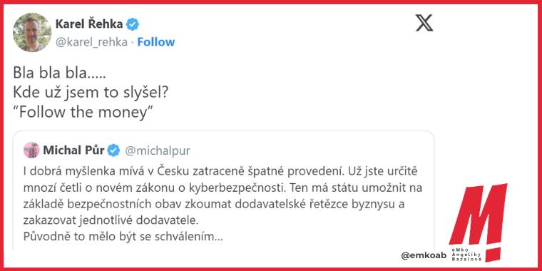 Stejně asertivně jako na jednáních ve sněmovně se Řehka chová i na sociálních sítích. Před několika týdny se například neudržel a vyjel na Twitteru na novináře Michala Půra. Jablkem sváru byl nový zákon o kyberbezpečnosti, který Řehka coby bývalý šéf NÚKIBu považuje za důležitý. “Bla, bla, bla, kde už jsem to jen slyšel. Follow the money,” odepsal výsměšně Půrovi a naznačil, že Půr kritizuje zákon ze zištných pohnutek.