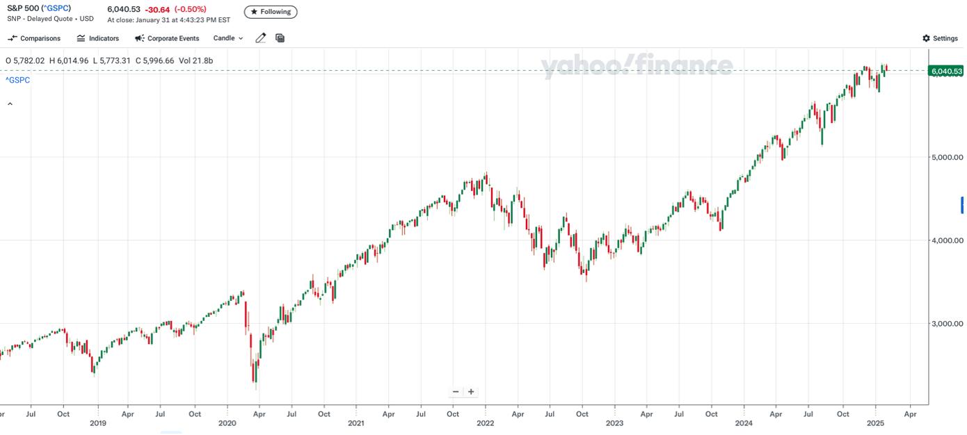Americký akciový index S&P 500, který obsahuje 500 největších amerických společností, uzavřel leden na hodnotě 6 040 bodů. To je poblíž historických maxim, jak je vidět na grafu (zdroj grafu: Yahoo Finance). Americkým akciím se poslední měsíce opravdu daří.