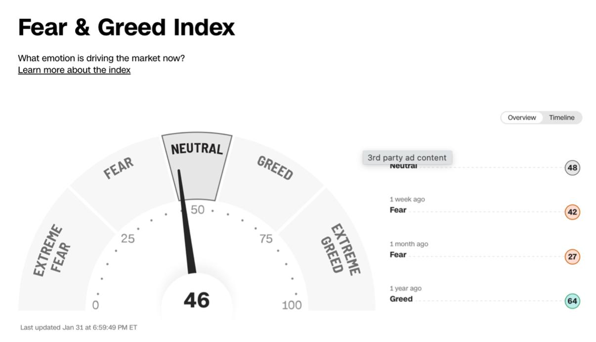 Sentiment investorů měří Fear and Greed index, který vyvinul americký zpravodajský portál CNN. Tento index ukazuje, zda investory ovládá chamtivost nebo naopak strach.