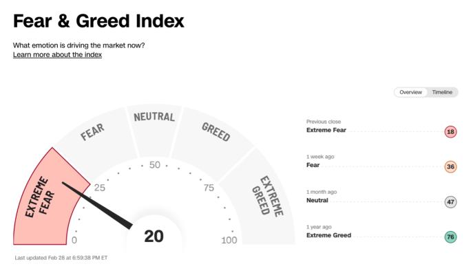 Fear and Greed index amerického zpravodajského portálu CNN, který měří náladu investorů, ukazuje na velký pesimismus. Index je aktuálně na hodnotě 20, což značí extrémní strach na akciových trzích.