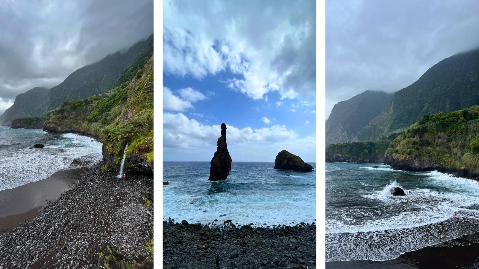 Pak jsme pokračovali na Praia do Seixal, nedalekou pláž (bohužel tedy taky známou primárně z Instagramu, ale tu aspoň právem). Kulisy útesů, hra slunce a mraků, vodopád na pláži a divoké vlny dohromady tvořily fakt nádherný výhled. Bohužel na koupání byla kvůli počasí moc velká zima, a tak jsme pokračovali na další vyhlídku Miradouro Ilhéus da Ribeira da Janela. Pak jsme chtěli jet ještě do Porto Moniz na koupání v přírodních bazénech, ale počasí nevypadalo, že by se mělo zlepšit, a tak jsme se vrátili do našeho apartmánu v Praia Formosa. Počkej příště, severe!