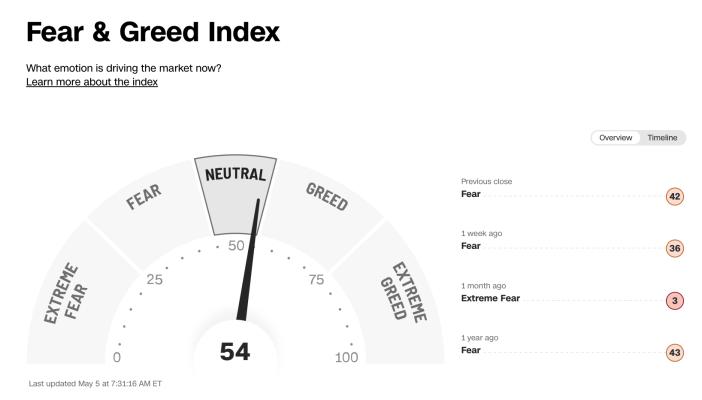 Zajímavý vývoj měl v dubnu i Fear and Greed index, který měří náladu investorů a který publikuje americký zpravodajský portál CNN.