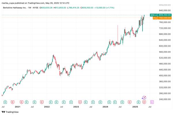 Série A akcií Berkshire Hathaway na konci dubna obchodovaly kolem 809 tisíc dolarů za jednu akcii, jak ukazuje graf na obrázku níže.