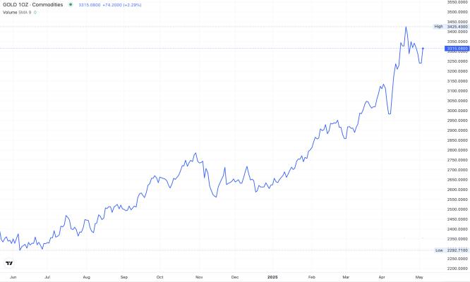 Zlato v dubnu dosáhlo dalšího historického rekordu přes 3 400 dolarů za trojskou unci (jedna trojská unce má 31,1 gramů), za poslední rok zlato vyrostlo o 50 %.