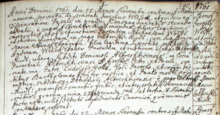 Léta Páně 1761, dne 15. měsíce listopadu uzavřel manželství slibem Josef Wöfll, na základě papežského dispensu v druhém přímém stupni pokrevního příbuzenství, ... s Marií Wincklbauerovou.