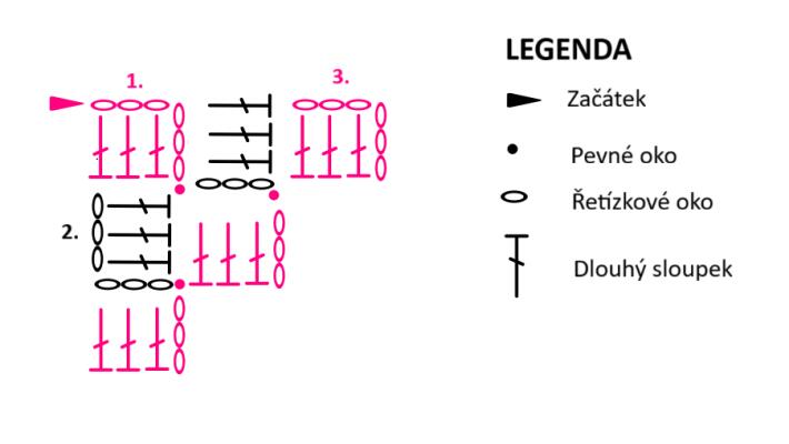 Uháčkujte si 6 ŘO, do 4. oka háčkujte DS, do dalších dvou ok po jednom DS a připojte PO pod ŘO z předchozího čtverečku. Háčkujte 3 ŘO, pod ŘO z předchozího čtverečku háčkujte 3 DS, pak připojte PO pod ŘO z předchozího čtverečku. Háčkujte 3 ŘO, pod ŘO z předchozího čtverečku háčkujte 3 DS (3 čtverečky, celkem máme 6 čtverečků)