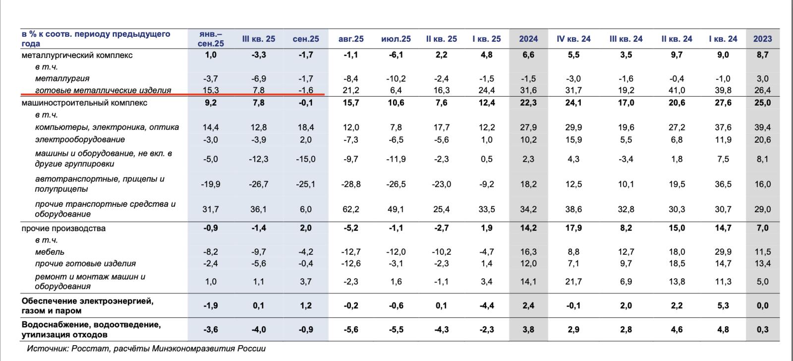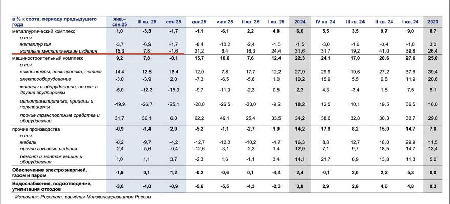 Pojďme na konkrétní data Rosstatu. Začněme u "hotových kovových výrobků", to je klíčovej ukazatel. Je to kategorie, kam spadá munice, hlavně, komponenty pro rakety, prostě všechno, co bouchá a zabíjí. Tenhle sektor měl v roce 2024 explozivní růst +31,6 % a ještě v srpnu 2025 rostl o slušných +21,2 %. A pak přišel náraz. V září 2025 se tenhle sektor meziročně propadl o -1,6 %. Z plus dvaceti na mínus jedna. Během třiceti dnů.