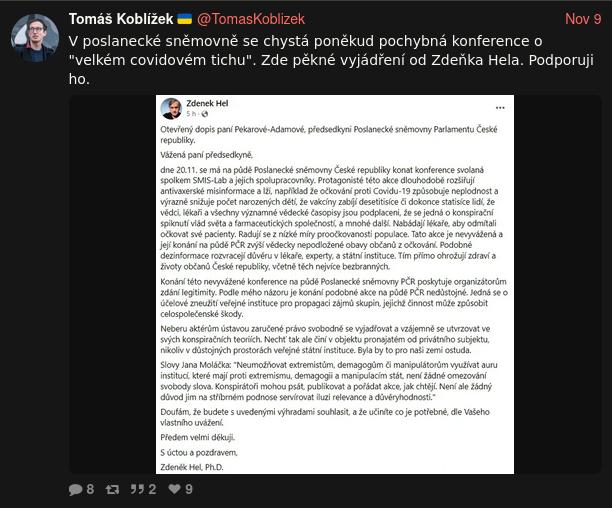 O množství dezinformací Tomáš Koblížek nic neříká, ale pokud čtu jeho další Xové výstupy správně (například jeho bezvýhradnou podporu paranoidnímu patologovi Zdeňku Helovi, když volal po zákazu poslaneckých akcí na půdě parlamentu: