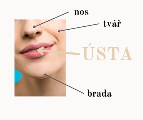Ústa jsou v dolní části obličeje. Pod ústy je brada, nad ústy je nos. Vedle úst jsou tváře.