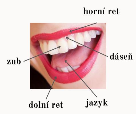 V ústech jsou zuby. V horní čelisti rostou horní zuby a v dolní čelisti rostou dolní zuby. Zuby jsou bílé a tvrdé. Kolem zubů jsou dásně. Dásně jsou růžové a měkké.