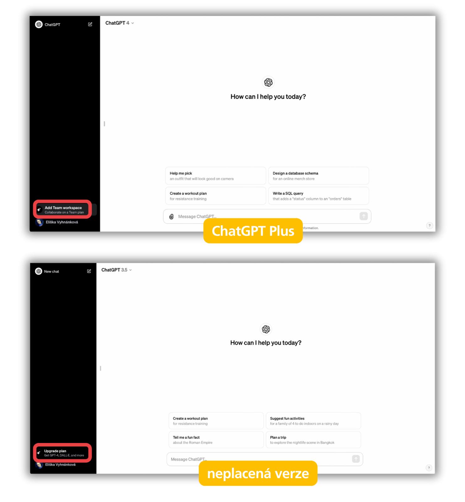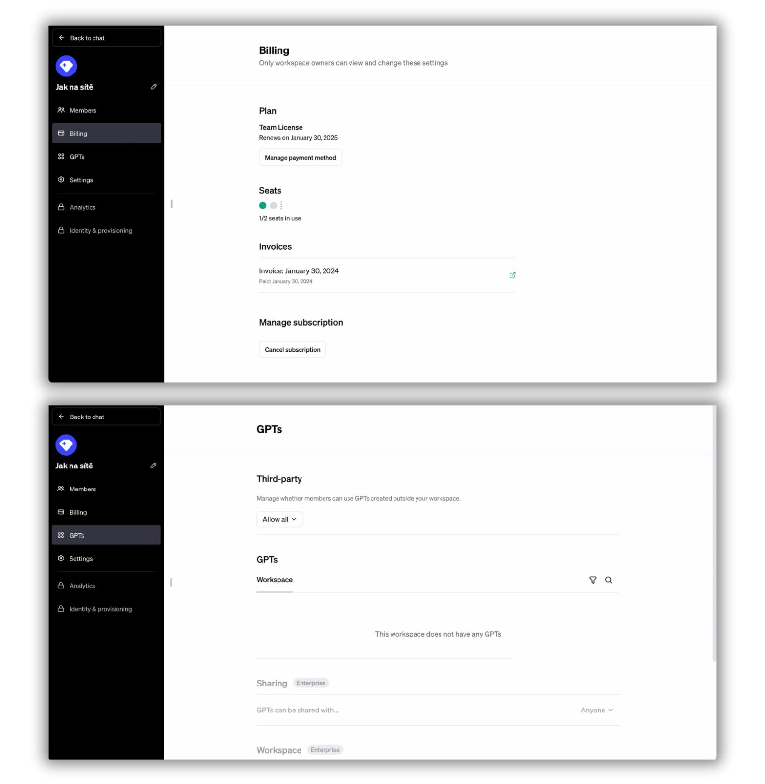 Mimochodem, posledním a definitivním argumentem pro přechod na ChatGPT Team byl fakt, že ChatGPT Plus nemá možnost přidat k předplatnému firemní údaje. Možná je to argument i pro vás. Každopádně si ale drobně připlatíte.