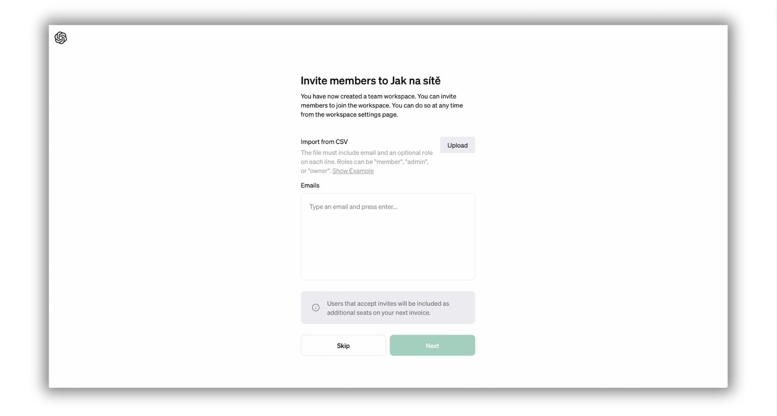 Po úspěšném zaplacení se objeví rovnou možnost pozvat kolegy (ať už s jednotlivými e-maily, nebo pomocí většího csv souboru s kontakty). Tuhle možnost můžete ale zatím přeskočit pomocí tlačítka Skip a nejdřív se v celém novém prostředí rozkoukat.