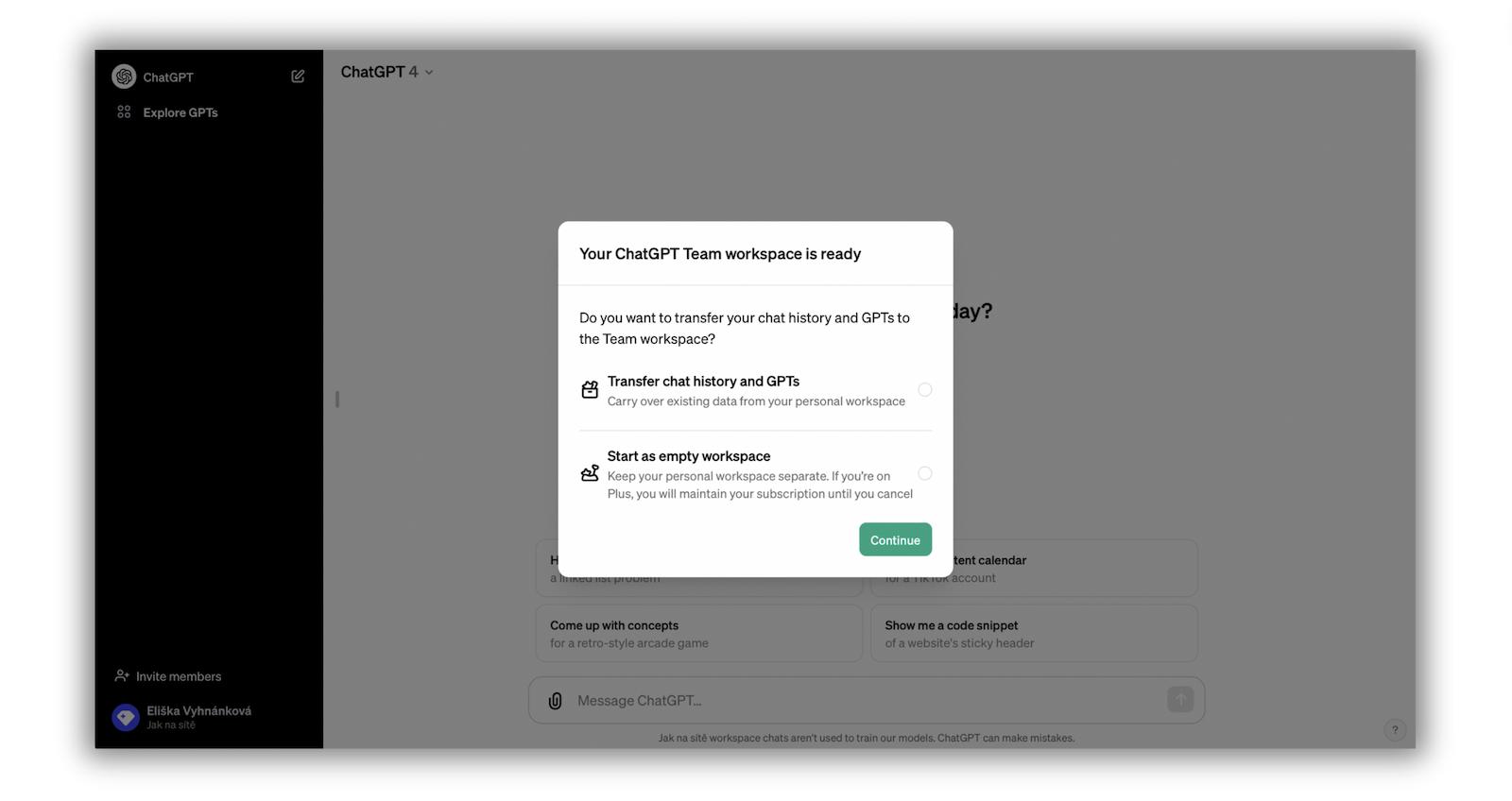 Proto bych troufale chtěla navrhnout, ať nejdřív vyberete možnost Start as empty workspace. Účty můžete dodatečně spojit i v nastavení (ve firemním profilu jděte do Settings & Beta - Data controls - Merge data from your personal workspace). Jestli máte na osobním účtu předplatné, můžete ho zrušit ručně.