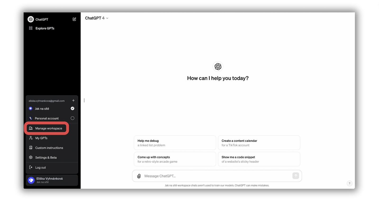 ❗ Až v Settings jsem zjistila, že v ChatGPT Team předplatném je možné sdílet konverzace pouze s ostatními členy týmu. Což může v budoucnu přinést jisté trable při psaní PickAI, ale to necháme na vyřešení budoucí Elišce. 😎