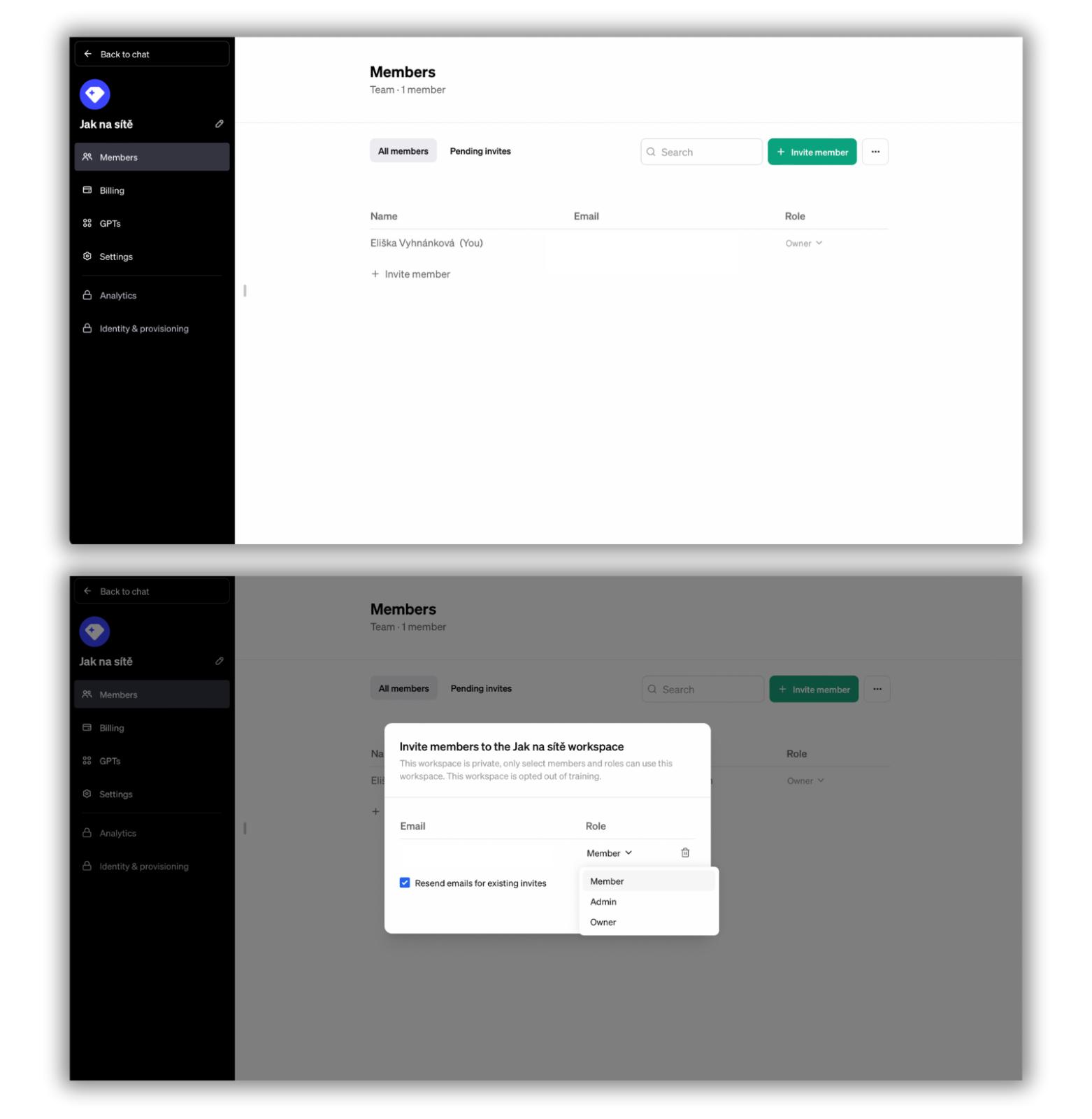 Levé menu v nastavení začíná možností upravit název a ikonku týmového účtu (ikonka tužky vedle názvu) a hned první položka vede do správy členů. Když pozvete nového kolegu, vybíráte si ze tří rolí – Member, Admin a Owner: