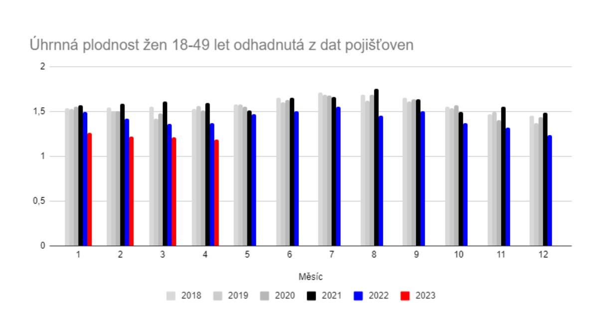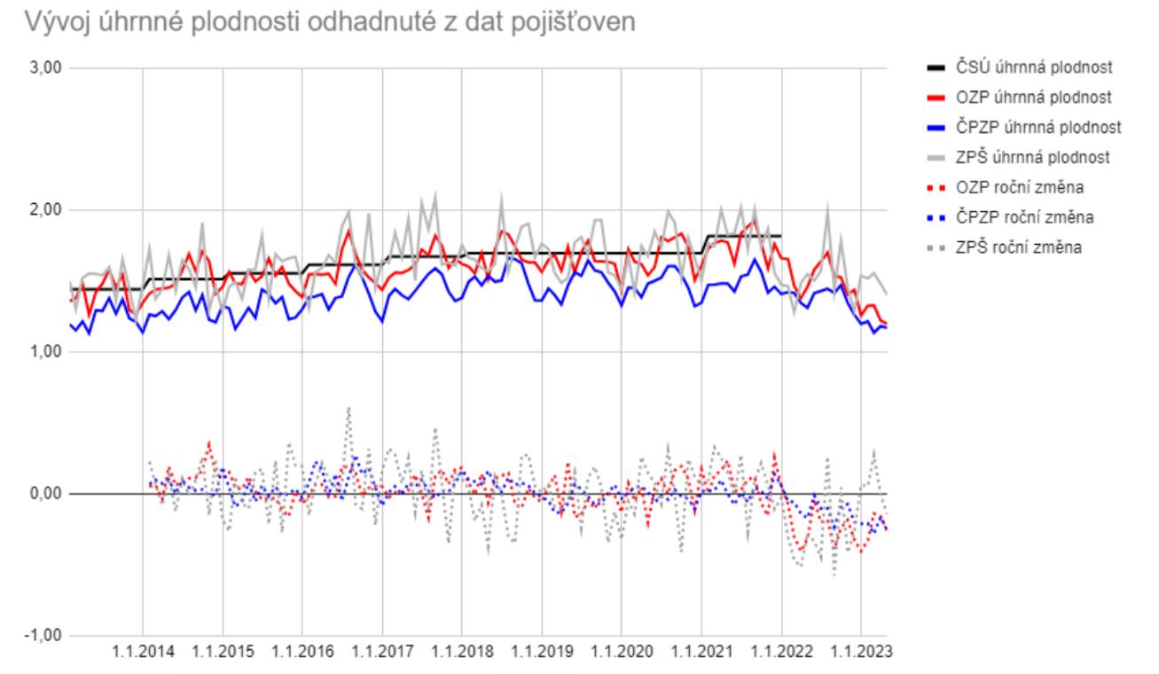 Úhrnná plodnost českých žen začala klesat v únoru 2022 a jak je vidět z nejnovějších dat, v roce 2023 pokles strmě pokračuje. Že nejde chybu potvrzuje srovnání dat pojišťovny ČPZP s dalšími zdravotními pojišťovnami - OZP a ZP Škoda. I tam vypadá situace podobně: