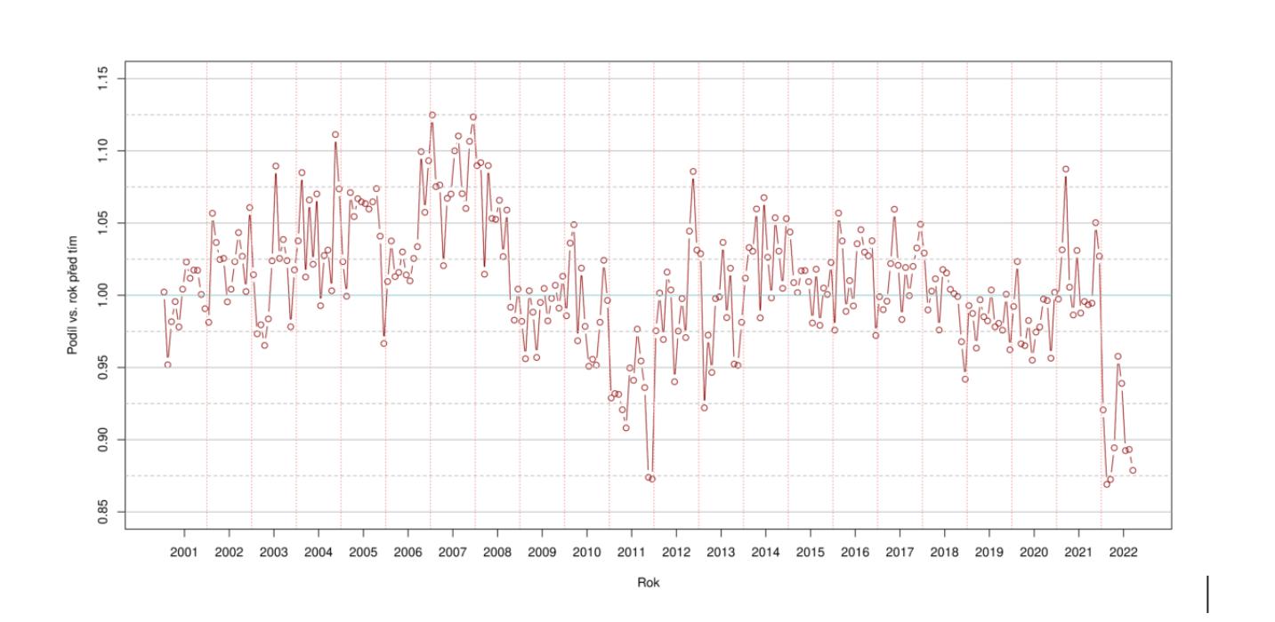 “Princip výpočtu úhrnné plodnosti jsem aplikovala i na počty screeningů, díky nimž můžeme odhadout další vývoj. Na počtu screeningů ve 20. týdnu těhotenství je změna trendu vidět už v říjnu 2021, což přesně koresponduje s pozorovanou změnou trendu úhrnné plodnosti v únoru 2022, tedy o 4 měsíce později, kdy ženy, které podstoupily screening, rodí,” popisuje Lucia Houfková metodu, jak k odhadu došla. “Trend vývoje plodnosti českých žen odvozený z počtu screeningů naznačuje, že pokles bude pokračovat i v dalších měsících.” .