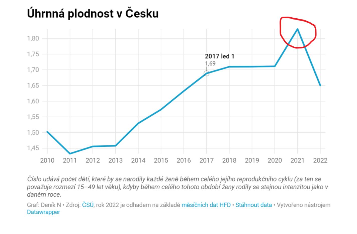 Obavy o nižší plodnost žen podle Koubského a Tesárkové nejsou na místě. Plodnost žen je podle DenikuN stabilní, dokonce i když za 2022 podle ČSÚ viditelně poklesla. Autor článku Petr Koubský pro tento výkyv našel vysvětlení, které doložil následujícím grafem. “V roce 2021 vylétla plodnost zdaleka nejvýše z celého desetiletí, píše se v DeníkuN doslova. Pokles v roce 2022 je tedy prý jen vyrovnáním tohoto schodku. Ženy si takříkajíc “předrodily” děti v roce 2021, a proto se jich v roce 2022 narodilo o něco méně. Tak nepanikařte, radí Koubský.