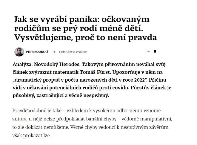 Za svou výzvu ale sklidil drsnou kritiku provax DenikuN. Autor Petr Koubský jakoukoliv souvislost s očkováním tvrdě odmítl. Hned v úvodu textu prohlásil, že Tomáš Fürst záměrně vyrábí paniku a manipuluje veřejností.